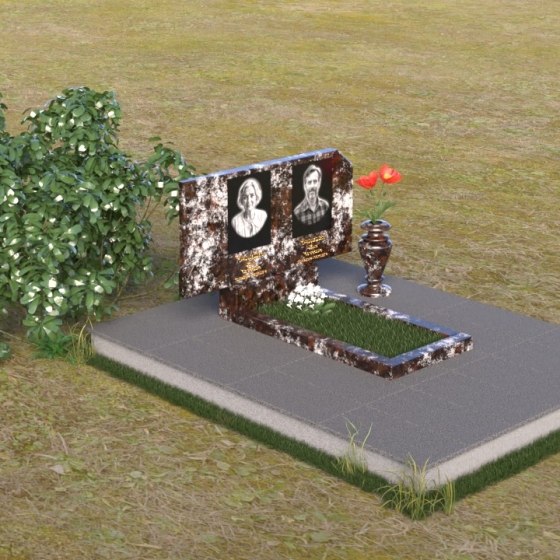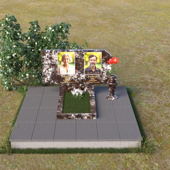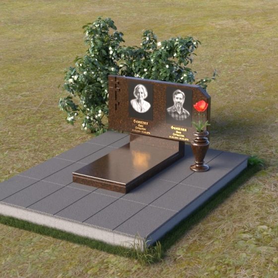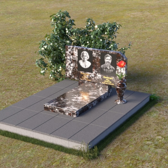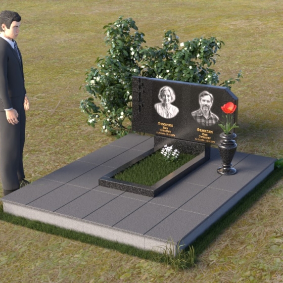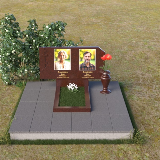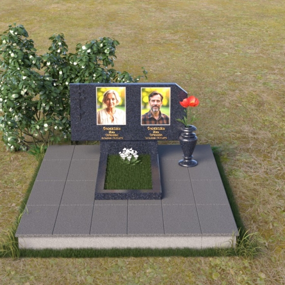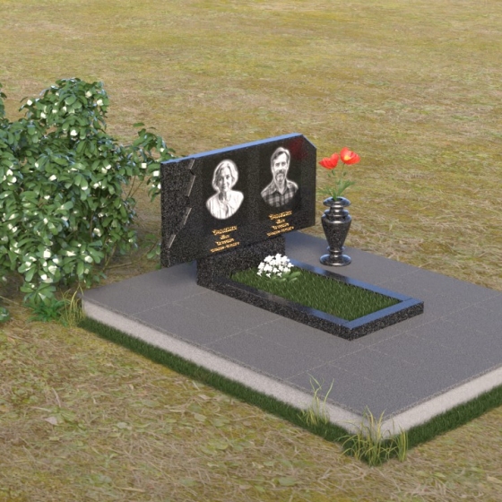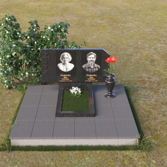 В верхней части памятника располагается вертикальная стела прямоугольной формы с небольшими скошенными углами, придающими ей более мягкий и благородный вид. На поверхности стелы размещены два портрета усопших, выполненные с высокой детализацией. В левом верхнем углу вырезано изображение православного креста, выполненного в лаконичном стиле, подчеркивающем сдержанность и глубину веры. Справа от портретов вырезана изящная роза с детально проработанными лепестками, символизирующая любовь и вечную память. Нижняя часть стелы плавно переходит в горизонтальную плиту, на которой размещается табличка с именами и датами жизни усопших. Горизонтальная плита, в свою очередь, опирается на строгий постамент, обеспечивающий устойчивость всей конструкции.
