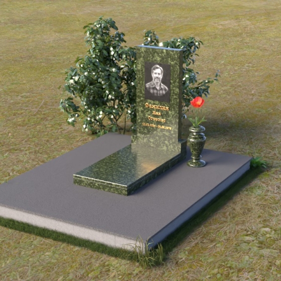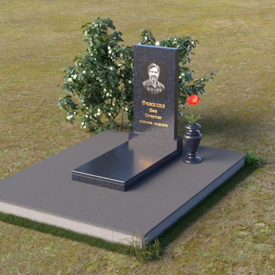 Мемориальная композиция представляет собой вертикальную стелу, выполненную в строгой прямоугольной форме, символизирующей стойкость и незыблемость памяти. Верхняя часть стелы, с ее четкими гранями, словно устремлена ввысь, к небесам, напоминая о духовной составляющей человеческой жизни. Боковые грани стелы обработаны с особой тщательностью, создавая эффект благородной сдержанности. Фаска, аккуратно снятая по периметру, придает изделию завершенный и элегантный вид. Горизонтальная плита, расположенная перед стелой, выполнена в зеркальной полировке, отражая небо и окружающий мир, символизируя продолжение жизни и связь с ушедшим.